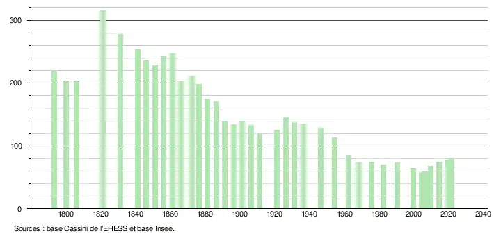 L'évolution du nombre d'habitants est connue à travers les recensements de la population effectués dans la commune depuis 1793. Pour les communes de moins de 10 000 habitants, une enquête de recensement portant sur toute la population est réalisée tous les cinq ans, les populations légales des années intermédiaires étant quant à elles estimées par interpolation ou extrapolation[23]. Pour la commune, le premier recensement exhaustif entrant dans le cadre du nouveau dispositif a été réalisé en 2004[24].