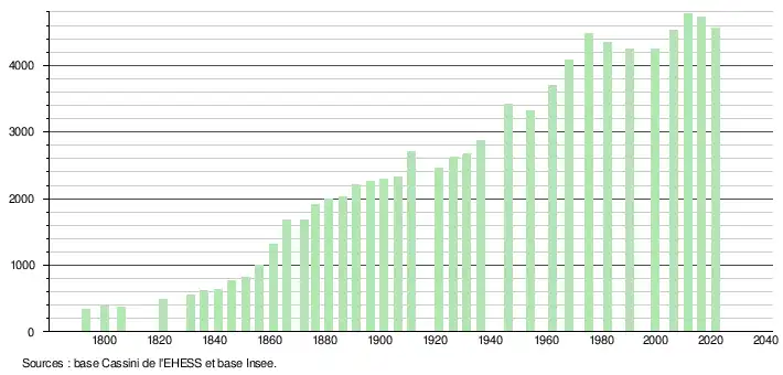 - Population municipale légale en vigueur au 1er janvier 2024, millésimée 2021, définie dans les limites territoriales en vigueur au 1er janvier 2023, date de référence statistique : 1er janvier 2021.