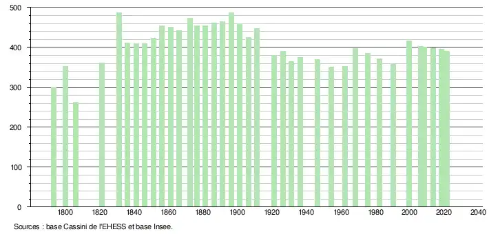 L'évolution du nombre d'habitants est connue à travers les recensements de la population effectués dans la commune depuis 1793. Pour les communes de moins de 10 000 habitants, une enquête de recensement portant sur toute la population est réalisée tous les cinq ans, les populations légales des années intermédiaires étant quant à elles estimées par interpolation ou extrapolation[26]. Pour la commune, le premier recensement exhaustif entrant dans le cadre du nouveau dispositif a été réalisé en 2008[27].