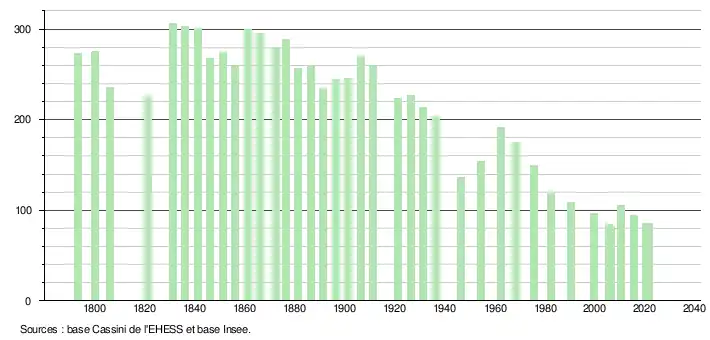 L'évolution du nombre d'habitants est connue à travers les recensements de la population effectués dans la commune depuis 1793. Pour les communes de moins de 10 000 habitants, une enquête de recensement portant sur toute la population est réalisée tous les cinq ans, les populations légales des années intermédiaires étant quant à elles estimées par interpolation ou extrapolation[17]. Pour la commune, le premier recensement exhaustif entrant dans le cadre du nouveau dispositif a été réalisé en 2005[18].