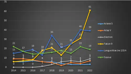 ![]() | Nombre de lancements spatiaux par lanceur (sélection) et par année Le lanceur Falcon 9 avec 60 vols en 2022 (nouveau record) domine le marché. Suivent des lanceurs anciens : Soyouz et Longue Marche 2/3/4. La fusée Electron (9 vols en 2022) domine largement le marché très actif des micro-lanceurs. L'Atlas V qui devrait être remplacé progressivement à compter de l'année prochaine fait également un bon score (7 vols en 2022). |