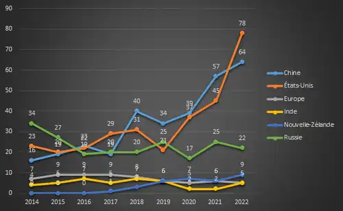 ![]() | Nombre de lancements spatiaux par pays (sélection) et par année Avec 78 lancements les États-Unis reprennent la tête du classement grace à la multiplication des vols de Falcon 9 (60) portés par le déploiement de la constellation Starlink. La Chine repasse en deuxième position mais avec un nombre de tirs qui continue de progresser (+9 par rapport à l'année précédente). Le nombre de tirs de la Russie, qui se maintient en 3e place, progresse (+5 tirs). L'Europe fait un score médiocre (échec du lanceur léger Vega et retard du premier vol Ariane 6). L'Inde, sans doute mal remise des répercussions de l'épidémie du Covid, n'a pas retrouvé son rythme de lancement d'avant crise. L'activité de lancement japonaise est pratiquement à l'arrêt avec un seul tir de son lanceur Epsilon qui est un échec. Enfin la Nouvelle-Zélande maintient le rythme de lancement de son micro-lanceur. |