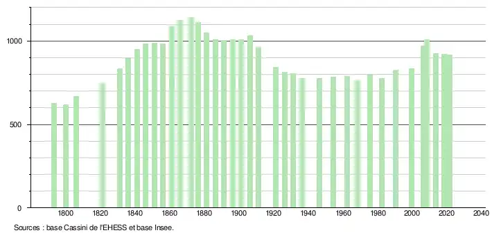 L'évolution du nombre d'habitants est connue à travers les recensements de la population effectués dans la commune depuis 1793. Pour les communes de moins de 10 000 habitants, une enquête de recensement portant sur toute la population est réalisée tous les cinq ans, les populations légales des années intermédiaires étant quant à elles estimées par interpolation ou extrapolation[37]. Pour la commune, le premier recensement exhaustif entrant dans le cadre du nouveau dispositif a été réalisé en 2008[38].