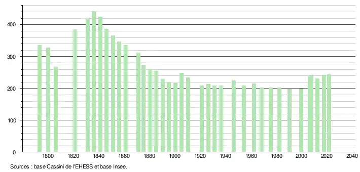 L'évolution du nombre d'habitants est connue à travers les recensements de la population effectués dans la commune depuis 1793. Pour les communes de moins de 10 000 habitants, une enquête de recensement portant sur toute la population est réalisée tous les cinq ans, les populations légales des années intermédiaires étant quant à elles estimées par interpolation ou extrapolation[16]. Pour la commune, le premier recensement exhaustif entrant dans le cadre du nouveau dispositif a été réalisé en 2007[17].