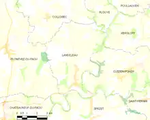 L'Aulne limite à l'est et au sud le territoire communal, séparant Landeleau respectivement de Kergloff à l'est, de Cléden-Poher au sud-est, de Spézet au sud. À l'ouest, c'est un affluent de rive droite de l'Aulne qui sert de limite communale avec Châteauneuf-du-Faou au sud-ouest et pour partie avec Plonévez-du-Faou à l'ouest, commune avec laquelle, plus au nord, la limite communale ne s'appuie pas sur des éléments naturels aussi nets, passant en lisière du bois de Coat Bihan. Au nord, la limite avec Collorec parcourt plateau et collines, longeant un temps la route départementale 48 allant de Collorec à Kergloff avant de coïncider pendant une distance d'environ deux kilomètres avec le cours aval de l'Éllez jusqu'à sa confluence avec l'Aulne à hauteur du hameau de Pénity-Saint-Laurent[1].