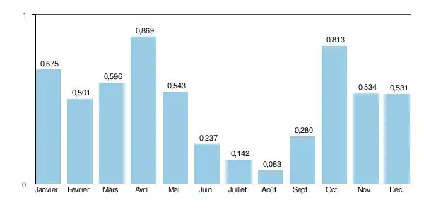 Sur cette courte période d'observation, le débit journalier maximal a été observé le pour 63,40 m3/s. Le débit instantané maximal a été observé le [note 4] avec 111,0 m3/s en même temps que la hauteur maximale instantanée de 307 cm soit 3,07 m[7].