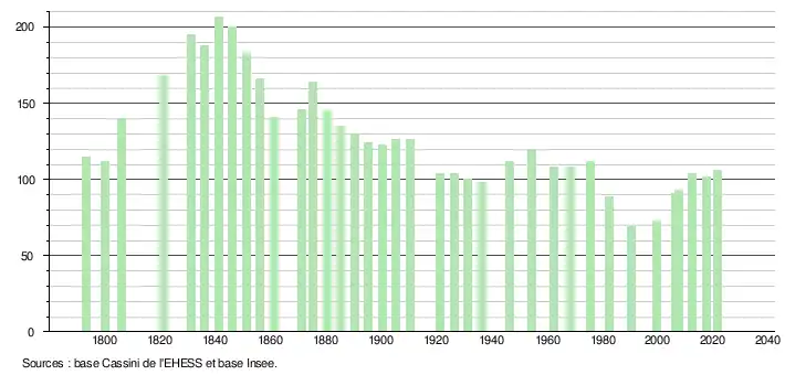 L'évolution du nombre d'habitants est connue à travers les recensements de la population effectués dans la commune depuis 1793. Pour les communes de moins de 10 000 habitants, une enquête de recensement portant sur toute la population est réalisée tous les cinq ans, les populations légales des années intermédiaires étant quant à elles estimées par interpolation ou extrapolation[16]. Pour la commune, le premier recensement exhaustif entrant dans le cadre du nouveau dispositif a été réalisé en 2007[17].