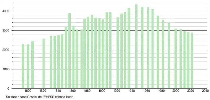 - Population municipale légale en vigueur au 1er janvier 2024, millésimée 2021, définie dans les limites territoriales en vigueur au 1er janvier 2023, date de référence statistique : 1er janvier 2021.