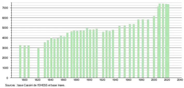 L'évolution du nombre d'habitants est connue à travers les recensements de la population effectués dans la commune depuis 1793. Pour les communes de moins de 10 000 habitants, une enquête de recensement portant sur toute la population est réalisée tous les cinq ans, les populations légales des années intermédiaires étant quant à elles estimées par interpolation ou extrapolation[40]. Pour la commune, le premier recensement exhaustif entrant dans le cadre du nouveau dispositif a été réalisé en 2008[41].