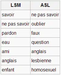 La LSM est liée à la vieille langue des signes française, langue qui a aussi été à l'origine de la langue des signes américaine (ASL), ce qui explique le similitudes de l'ASL et de la LSM[9]. Les études de Smith-Stark (1986) et de Bickford (1991) montrent une similarité linguistique de 23 % entre ces deux langues, mais il existe aussi 17 % des signes qui sont des faux-amis, certains pouvant poser problème car ils sont similaires d'un point de vue sémantique, d'un sens réellement différent ou même potentiellement offensant, comme le montre le tableau de droite[8].