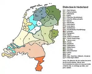 - le bas allemand (Plattdüütsch), une langue germanique occidentale, surtout la branche occidentale du bas-allemand, regroupant plusieurs dialectes du Nord-Est des Pays-Bas (Groningue, Frise, Drenthe, Overijssel, Gueldre) et également parlé au Nord-Ouest de l'Allemagne.