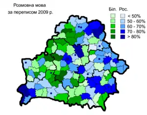 Lors du recensement de 1999, 62,8 % des Biélorusses avaient le russe comme principale langue parlée à la maison[4] contre 70,2 % en 2009, soit une hausse de 7,4 points, tandis que le biélorusse est passé de 36,7 % en 1999[4] à 23,4 % en 2009, soit une baisse de 13,3 points. En ville, le russe est la principale langue parlée à la maison pour 81,9 % des habitants et le biélorusse pour 11,3 % d'entre eux, tandis qu'à la campagne ils sont respectivement de 36,2 % et 58,7 %.
