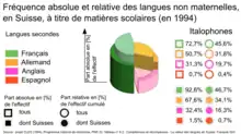 L'italien et le romanche, fortement minoritaires, sont soutenus par l'État fédéral. Enfin, en raison d'une forte immigration, environ 21 % de la population résidente parle une langue étrangère non nationale comme langue principale (les langues principales totalisent plus de 100 % car depuis 2010 les Suisses peuvent en indiquer plusieurs lors des recensements)[14].