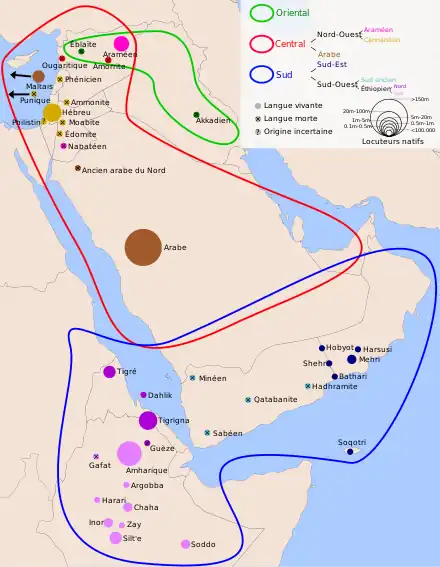 (Estimation du nombre de locuteurs actuels des langues sémitiques les plus répandues.)[réf. souhaitée]