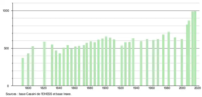 L'évolution du nombre d'habitants est connue à travers les recensements de la population effectués dans la commune depuis 1793. Pour les communes de moins de 10 000 habitants, une enquête de recensement portant sur toute la population est réalisée tous les cinq ans, les populations légales des années intermédiaires étant quant à elles estimées par interpolation ou extrapolation[33]. Pour la commune, le premier recensement exhaustif entrant dans le cadre du nouveau dispositif a été réalisé en 2008[34].