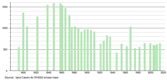 L'évolution du nombre d'habitants est connue à travers les recensements de la population effectués dans la commune depuis 1793. Pour les communes de moins de 10 000 habitants, une enquête de recensement portant sur toute la population est réalisée tous les cinq ans, les populations légales des années intermédiaires étant quant à elles estimées par interpolation ou extrapolation[20]. Pour la commune, le premier recensement exhaustif entrant dans le cadre du nouveau dispositif a été réalisé en 2004[21].