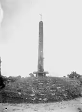 La dénomination de lanterne des morts ne fait toutefois pas l'unanimité et semble devoir définitivement être abandonnée[7],[8]. Même si la différence d'aspect est parfois ténue, il semble beaucoup plus vraisemblable qu'il s'agisse d'une croix hosannière[2], comme le suggèrent la hauteur des gradins qui la soutiennent, la structure pleine et le faible diamètre de sa colonne, qui interdisent à un homme de hisser un fanal à son sommet par l'intérieur comme c'est courant pour une lanterne des morts[9],[10]. Dans cette hypothèse, ce serait donc un croix en pierre ou en fer forgé, accompagnée d'un crochet permettant d'y suspendre des couronnes votives, qui aurait terminé la colonne[11]. Des documents du XVIIIe siècle et une photo montrant la colonne utilisée comme croix hosannière au début du XXe siècle renforcent cette proposition[12].