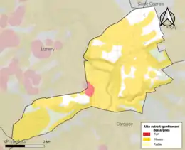 La commune est vulnérable au risque de mouvements de terrains constitué principalement du retrait-gonflement des sols argileux[16]. Cet aléa est susceptible d'engendrer des dommages importants aux bâtiments en cas d’alternance de périodes de sécheresse et de pluie. 76,4 % de la superficie communale est en aléa moyen ou fort (90 % au niveau départemental et 48,5 % au niveau national). Sur les 108 bâtiments dénombrés sur la commune en 2019, 95 sont en aléa moyen ou fort, soit 88 %, à comparer aux 83 % au niveau départemental et 54 % au niveau national. Une cartographie de l'exposition du territoire national au retrait gonflement des sols argileux est disponible sur le site du BRGM[17],[Carte 2].