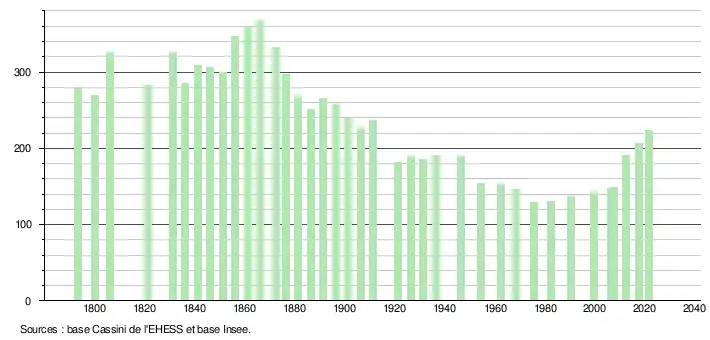 L'évolution du nombre d'habitants est connue à travers les recensements de la population effectués dans la commune depuis 1793. Pour les communes de moins de 10 000 habitants, une enquête de recensement portant sur toute la population est réalisée tous les cinq ans, les populations légales des années intermédiaires étant quant à elles estimées par interpolation ou extrapolation[22]. Pour la commune, le premier recensement exhaustif entrant dans le cadre du nouveau dispositif a été réalisé en 2007[23].
