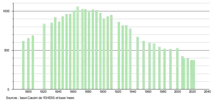 L'évolution du nombre d'habitants est connue à travers les recensements de la population effectués dans la commune depuis 1793. Pour les communes de moins de 10 000 habitants, une enquête de recensement portant sur toute la population est réalisée tous les cinq ans, les populations légales des années intermédiaires étant quant à elles estimées par interpolation ou extrapolation[30]. Pour la commune, le premier recensement exhaustif entrant dans le cadre du nouveau dispositif a été réalisé en 2008[31].