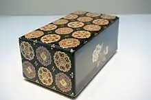 - maki-e (蒔絵) utilisant des poudres métalliques, y compris l'or, l'argent, le cuivre et leurs alliages, étalés avec des tubes de bambou ou des pinceaux fins. En hiramaki-e, les poudres sont déposées sur la laque humide pour être ensuite recouvertes d'une autre couche de laque. Takamaki-e réalise un effet de relief élevé par couches répétées, y compris parfois l'ajout de charbon de bois, de sciure ou d'argile[27]. Togidashi-e consiste à recouvrir le maki-e original de plusieurs couches de laque, puis à le polir jusqu'à ce que le dessin soit visible[38].