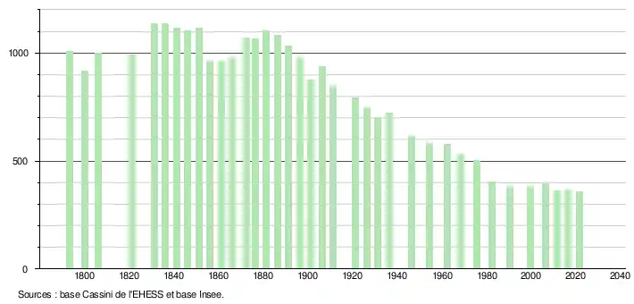 L'évolution du nombre d'habitants est connue à travers les recensements de la population effectués dans la commune depuis 1793. Pour les communes de moins de 10 000 habitants, une enquête de recensement portant sur toute la population est réalisée tous les cinq ans, les populations légales des années intermédiaires étant quant à elles estimées par interpolation ou extrapolation[28]. Pour la commune, le premier recensement exhaustif entrant dans le cadre du nouveau dispositif a été réalisé en 2006[29].
