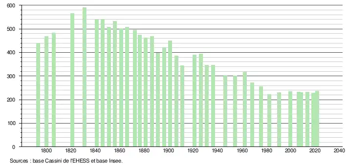L'évolution du nombre d'habitants est connue à travers les recensements de la population effectués dans la commune depuis 1793. Pour les communes de moins de 10 000 habitants, une enquête de recensement portant sur toute la population est réalisée tous les cinq ans, les populations légales des années intermédiaires étant quant à elles estimées par interpolation ou extrapolation[29]. Pour la commune, le premier recensement exhaustif entrant dans le cadre du nouveau dispositif a été réalisé en 2008[30].