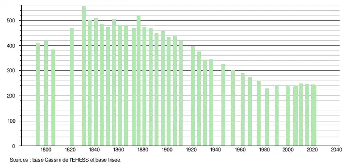 | L'évolution du nombre d'habitants est connue à travers les recensements de la population effectués dans la commune depuis 1793. Pour les communes de moins de 10 000 habitants, une enquête de recensement portant sur toute la population est réalisée tous les cinq ans, les populations légales des années intermédiaires étant quant à elles estimées par interpolation ou extrapolation[22]. Pour la commune, le premier recensement exhaustif entrant dans le cadre du nouveau dispositif a été réalisé en 2005[23]. En 2021, la commune comptait 242 habitants[Note 2], en diminution de 2,02 % par rapport à 2015 (Landes : +4,9 %, France hors Mayotte : +1,84 %). |