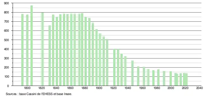 L'évolution du nombre d'habitants est connue à travers les recensements de la population effectués dans la commune depuis 1793. Pour les communes de moins de 10 000 habitants, une enquête de recensement portant sur toute la population est réalisée tous les cinq ans, les populations légales des années intermédiaires étant quant à elles estimées par interpolation ou extrapolation[39]. Pour la commune, le premier recensement exhaustif entrant dans le cadre du nouveau dispositif a été réalisé en 2008[40].