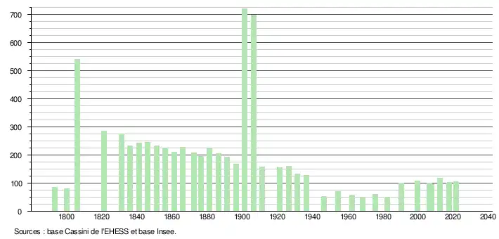 L'évolution du nombre d'habitants est connue à travers les recensements de la population effectués dans la commune depuis 1793. Pour les communes de moins de 10 000 habitants, une enquête de recensement portant sur toute la population est réalisée tous les cinq ans, les populations légales des années intermédiaires étant quant à elles estimées par interpolation ou extrapolation[16]. Pour la commune, le premier recensement exhaustif entrant dans le cadre du nouveau dispositif a été réalisé en 2007[17].