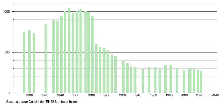 L'évolution du nombre d'habitants est connue à travers les recensements de la population effectués dans la commune depuis 1793. Pour les communes de moins de 10 000 habitants, une enquête de recensement portant sur toute la population est réalisée tous les cinq ans, les populations légales des années intermédiaires étant quant à elles estimées par interpolation ou extrapolation[30]. Pour la commune, le premier recensement exhaustif entrant dans le cadre du nouveau dispositif a été réalisé en 2007[31].