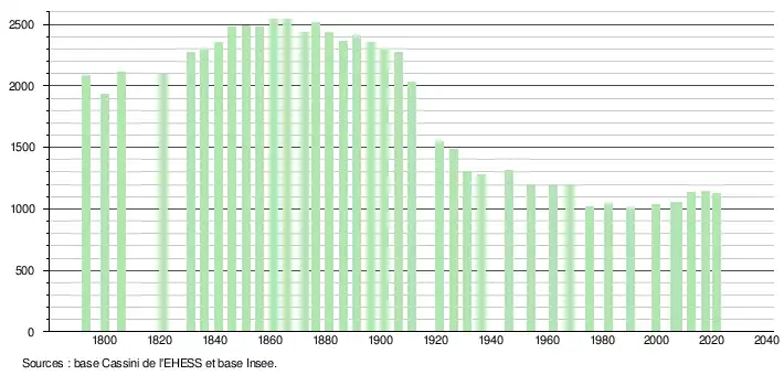 L'évolution du nombre d'habitants est connue à travers les recensements de la population effectués dans la commune depuis 1793. Pour les communes de moins de 10 000 habitants, une enquête de recensement portant sur toute la population est réalisée tous les cinq ans, les populations légales des années intermédiaires étant quant à elles estimées par interpolation ou extrapolation[28]. Pour la commune, le premier recensement exhaustif entrant dans le cadre du nouveau dispositif a été réalisé en 2007[29].