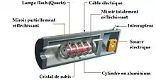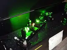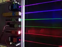 Un laser (acronyme issu de l'anglais light amplification by stimulated emission of radiation qui signifie « amplification de la lumière par émission stimulée de radiation ») est un système photonique. Il s'agit d'un appareil qui produit un rayonnement lumineux spatialement et temporellement cohérent reposant sur le processus d'émission stimulée. La lumière du laser est aussi appelée lumière cohérente. Descendant du maser[1], le laser s'est d'abord appelé « maser optique ».