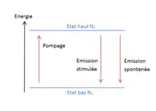 Dans le cas d'un modèle de transition entre 2 niveaux bas et haut, notés respectivement et , la population de l'état haut doit être supérieure à la population de l'état bas pour qu'il y ait émission : .