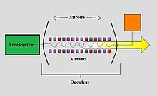 La grande différence entre les lasers à électrons libres et les machines à rayonnement synchrotron classiques se situe dans la longueur des onduleurs : alors que ceux utilisés dans les machines classiques sont de taille modeste (au maximum quelques mètres pour des synchrotrons de rayons X), les onduleurs des lasers à électrons libres peuvent faire jusqu'à plusieurs centaines de mètres pour les machines fonctionnant dans le domaine des rayons X durs. Pour la production de rayons X, European XFEL utilise un accélérateur supraconducteur à électrons permettant d'obtenir 27000 impulsions par seconde[5]. Avec une longueur de 3,4 km[6], il est le plus grand du monde dans sa catégorie.