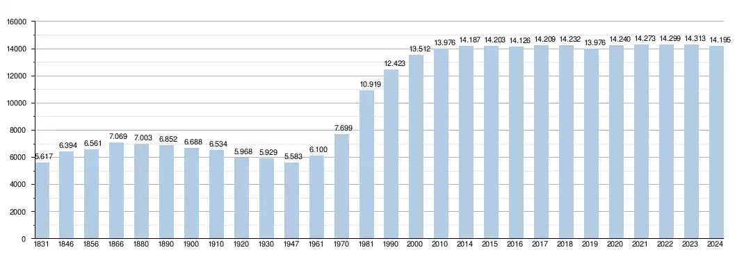 Elle comptait, au , 14 215 habitants (6 916 hommes et 7 299 femmes), soit une densité de 298,82 habitants/km²[7] pour une superficie de 47,57 km².