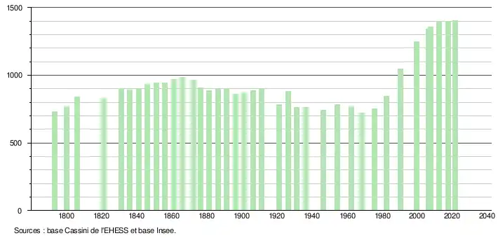 L'évolution du nombre d'habitants est connue à travers les recensements de la population effectués dans la commune depuis 1793. Pour les communes de moins de 10 000 habitants, une enquête de recensement portant sur toute la population est réalisée tous les cinq ans, les populations légales des années intermédiaires étant quant à elles estimées par interpolation ou extrapolation[19]. Pour la commune, le premier recensement exhaustif entrant dans le cadre du nouveau dispositif a été réalisé en 2007[20].
