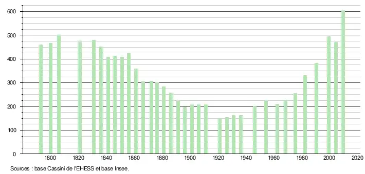 - Dans le tableau des recensements et le graphique, par convention dans Wikipédia, le principe a été retenu, pour les populations légales postérieures à 1999 de n’afficher dans le tableau des recensements et le graphique que les populations correspondant à l'année 2006, première population légale publiée calculée conformément aux concepts définis dans le décret no 2003-485 du 5 juin 2003, et les années correspondant à une enquête exhaustive de recensement pour les communes de moins de 10 000 habitants, ainsi que la dernière population légale publiée par l’Insee.