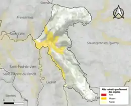 Le retrait-gonflement des sols argileux est susceptible d'engendrer des dommages importants aux bâtiments en cas d’alternance de périodes de sécheresse et de pluie. 15,1 % de la superficie communale est en aléa moyen ou fort (67,7 % au niveau départemental et 48,5 % au niveau national). Sur les 187 bâtiments dénombrés sur la commune en 2019, 63 sont en aléa moyen ou fort, soit 34 %, à comparer aux 72 % au niveau départemental et 54 % au niveau national. Une cartographie de l'exposition du territoire national au retrait gonflement des sols argileux est disponible sur le site du BRGM[25],[Carte 2].