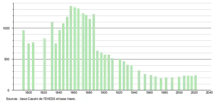 L'évolution du nombre d'habitants est connue à travers les recensements de la population effectués dans la commune depuis 1793. Pour les communes de moins de 10 000 habitants, une enquête de recensement portant sur toute la population est réalisée tous les cinq ans, les populations légales des années intermédiaires étant quant à elles estimées par interpolation ou extrapolation[32]. Pour la commune, le premier recensement exhaustif entrant dans le cadre du nouveau dispositif a été réalisé en 2006[33].