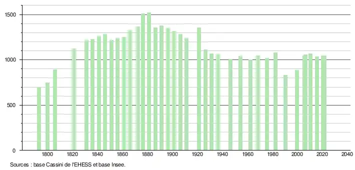 L'évolution du nombre d'habitants est connue à travers les recensements de la population effectués dans la commune depuis 1793. Pour les communes de moins de 10 000 habitants, une enquête de recensement portant sur toute la population est réalisée tous les cinq ans, les populations légales des années intermédiaires étant quant à elles estimées par interpolation ou extrapolation[38]. Pour la commune, le premier recensement exhaustif entrant dans le cadre du nouveau dispositif a été réalisé en 2005[39].