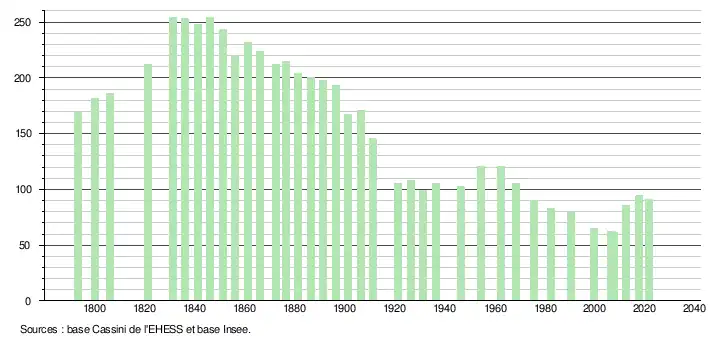 L'évolution du nombre d'habitants est connue à travers les recensements de la population effectués dans la commune depuis 1793. Pour les communes de moins de 10 000 habitants, une enquête de recensement portant sur toute la population est réalisée tous les cinq ans, les populations légales des années intermédiaires étant quant à elles estimées par interpolation ou extrapolation[15]. Pour la commune, le premier recensement exhaustif entrant dans le cadre du nouveau dispositif a été réalisé en 2007[16].