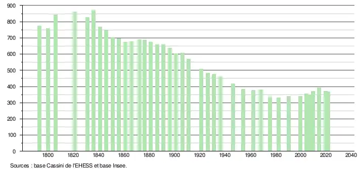 | L'évolution du nombre d'habitants est connue à travers les recensements de la population effectués dans la commune depuis 1793. Pour les communes de moins de 10 000 habitants, une enquête de recensement portant sur toute la population est réalisée tous les cinq ans, les populations légales des années intermédiaires étant quant à elles estimées par interpolation ou extrapolation[22]. Pour la commune, le premier recensement exhaustif entrant dans le cadre du nouveau dispositif a été réalisé en 2004[23]. En 2021, la commune comptait 368 habitants[Note 2], en diminution de 5,88 % par rapport à 2015 (Landes : +4,9 %, France hors Mayotte : +1,84 %). |