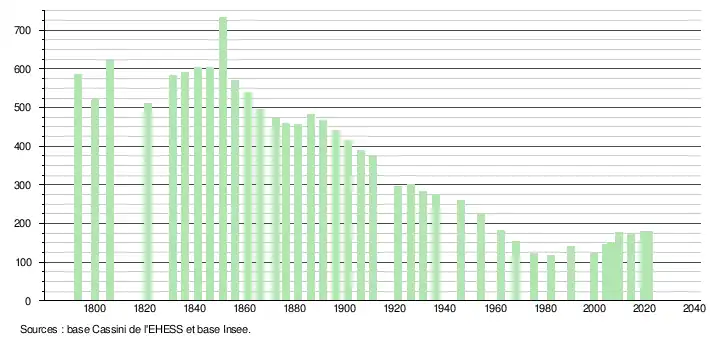 L'évolution du nombre d'habitants est connue à travers les recensements de la population effectués dans la commune depuis 1793. Pour les communes de moins de 10 000 habitants, une enquête de recensement portant sur toute la population est réalisée tous les cinq ans, les populations légales des années intermédiaires étant quant à elles estimées par interpolation ou extrapolation[27]. Pour la commune, le premier recensement exhaustif entrant dans le cadre du nouveau dispositif a été réalisé en 2004[28].