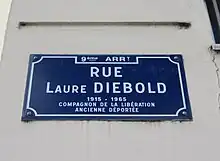- une rue Laure-Diebold à Paris (depuis 2014 dans le quartier rénové de la ZAC Beaujon, dans le 8e arrondissement)[9],[3] ;