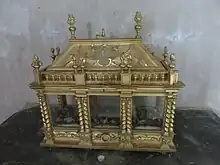 En 1793, la châsse fut cachée dans la crypte et échappa à la destruction. Puis fut, à la fin de la tourmente, remise à sa place au fond de l'abside. Elle contient : un fémur, un fragment d'humérus, deux os maxillaires et plusieurs vertèbres. Deux petits ossements sont enfermés, l'un dans un reliquaire d'argent à l'effigie du saint et l'autre dans sa représentation en buste, les deux entreposés dans la crypte.