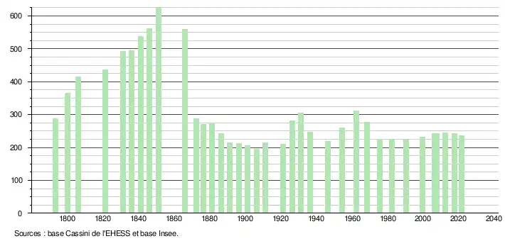 L'évolution du nombre d'habitants est connue à travers les recensements de la population effectués dans la commune depuis 1793. Pour les communes de moins de 10 000 habitants, une enquête de recensement portant sur toute la population est réalisée tous les cinq ans, les populations légales des années intermédiaires étant quant à elles estimées par interpolation ou extrapolation[21]. Pour la commune, le premier recensement exhaustif entrant dans le cadre du nouveau dispositif a été réalisé en 2007[22].