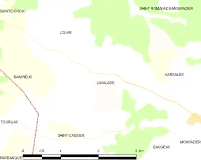 Lavalade est limitrophe de quatre autres communes dont Rampieux à l'ouest sur environ 125 mètres. Au sud-est, son territoire est distant d'une cinquantaine de mètres de celui de Gaugeac.