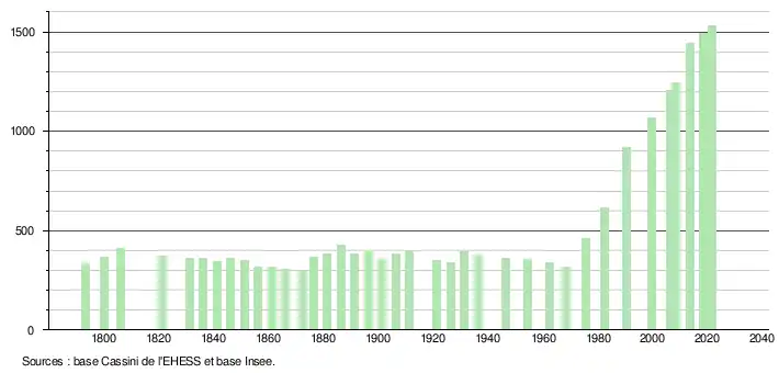 | L'évolution du nombre d'habitants est connue à travers les recensements de la population effectués dans la commune depuis 1793. Pour les communes de moins de 10 000 habitants, une enquête de recensement portant sur toute la population est réalisée tous les cinq ans, les populations légales des années intermédiaires étant quant à elles estimées par interpolation ou extrapolation[24]. Pour la commune, le premier recensement exhaustif entrant dans le cadre du nouveau dispositif a été réalisé en 2008[25]. En 2021, la commune comptait 1 532 habitants[Note 3], en augmentation de 1,73 % par rapport à 2015 (Aude : +2,47 %, France hors Mayotte : +1,84 %). |