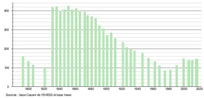 L'évolution du nombre d'habitants est connue à travers les recensements de la population effectués dans la commune depuis 1793. Pour les communes de moins de 10 000 habitants, une enquête de recensement portant sur toute la population est réalisée tous les cinq ans, les populations légales des années intermédiaires étant quant à elles estimées par interpolation ou extrapolation[3]. Pour la commune, le premier recensement exhaustif entrant dans le cadre du nouveau dispositif a été réalisé en 2005[4].